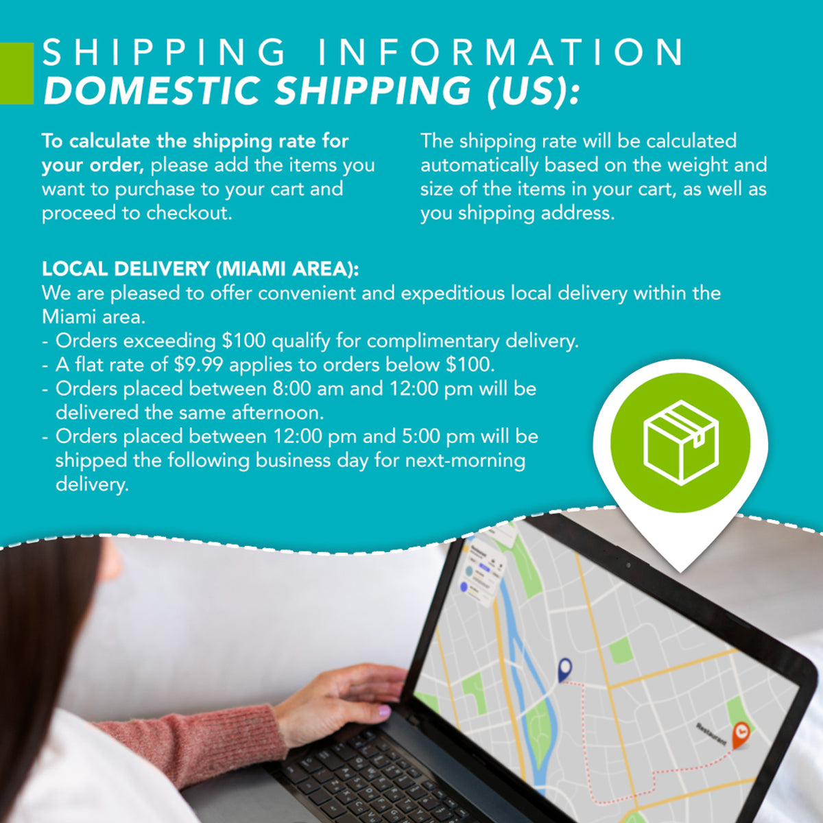 - Free shipping on orders over $100! We also offer local delivery in the Miami area. Check out our shipping information for details.